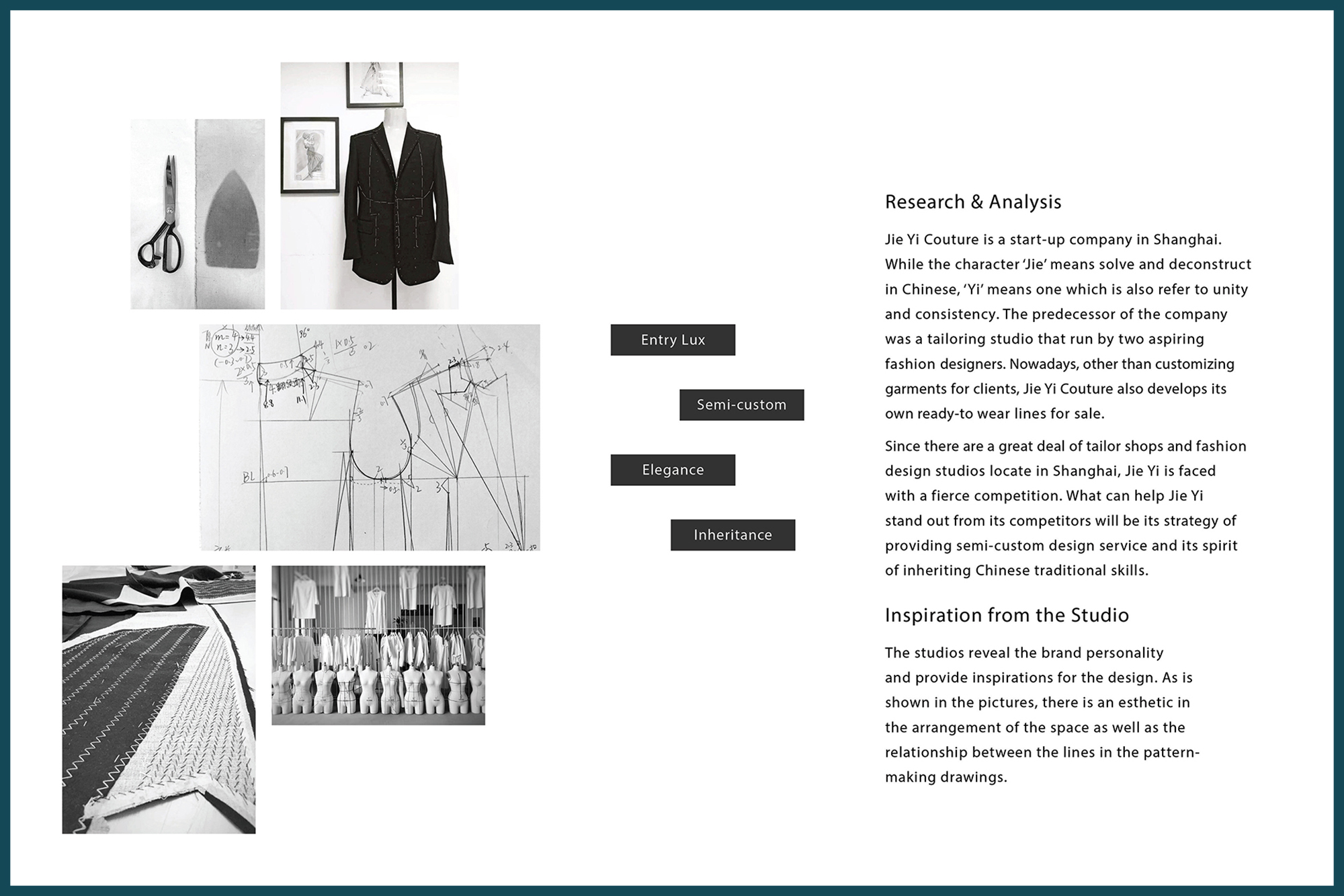 A branding project for Jie Yi Couture — a fashion studio that inherits traditinal tailoring skills and provides semi-customization and ready-to-wear service.